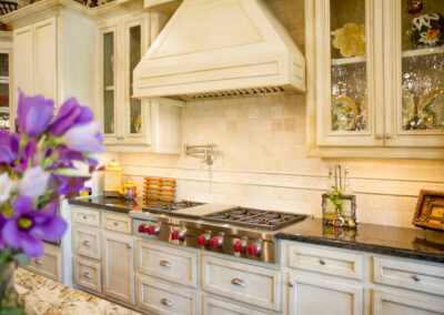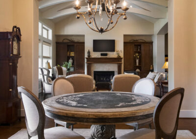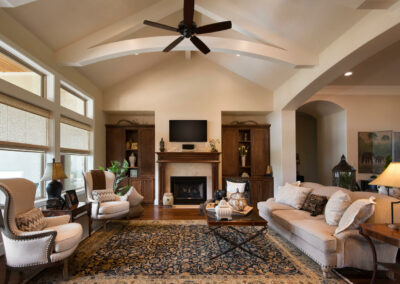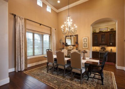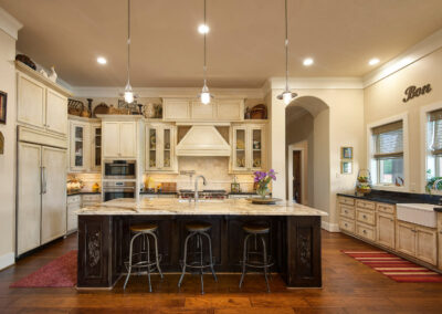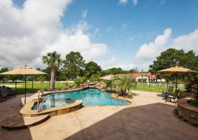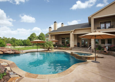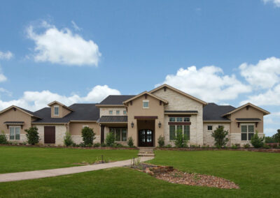 We built this custom Hill Country-style home with a stone and stucco exterior, tall columns, and a wide front lawn. The backyard features a lagoon-style pool with a spa, rock waterfall, and tanning shelf. Inside, the kitchen has double ovens and a large island, and the primary bath includes a jetted tub with dual walk-through showers.