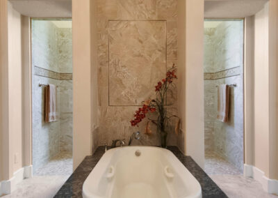 Jetted tub, two walk-through showers, natural stone, and a vaulted ceiling