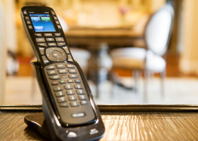 Vaulted ceiling, chandelier, wine fridge, and built-in buffet