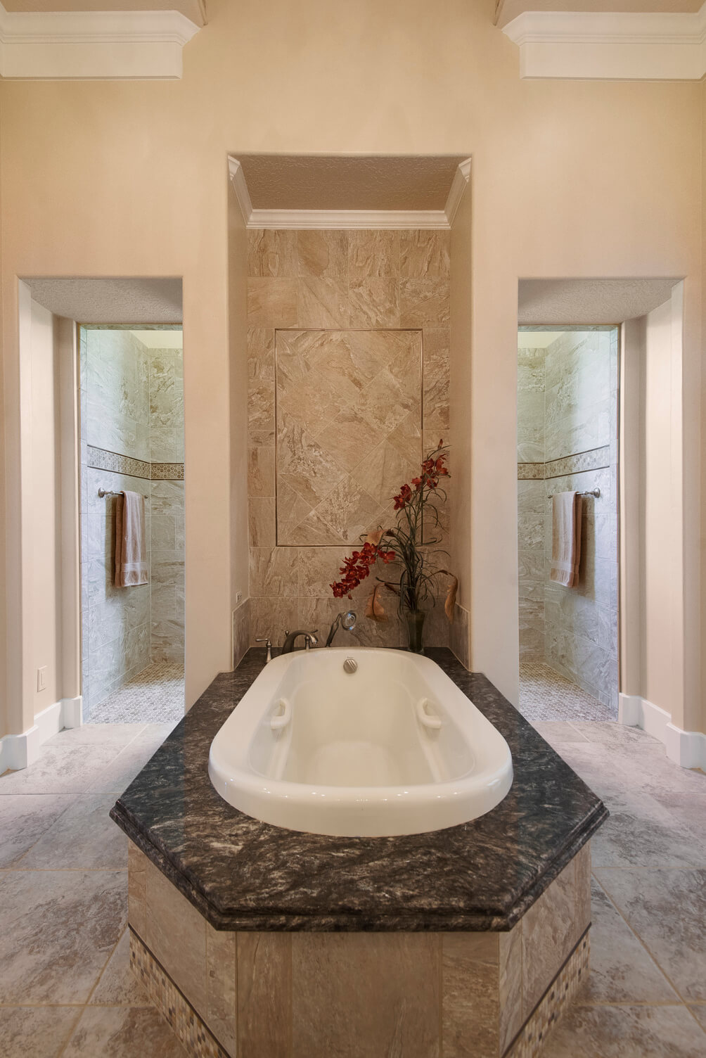Jetted tub, two walk-through showers, natural stone, and a vaulted ceiling