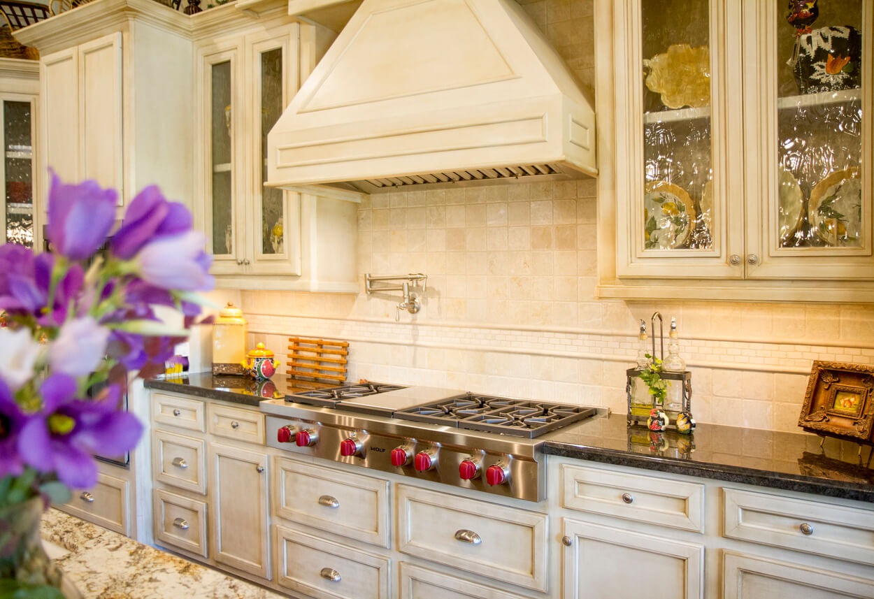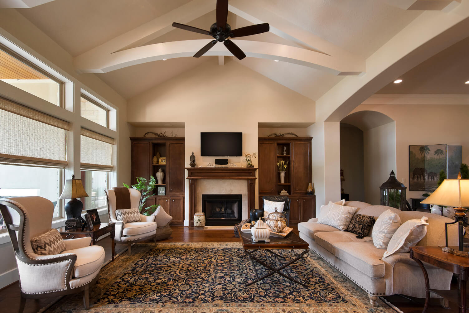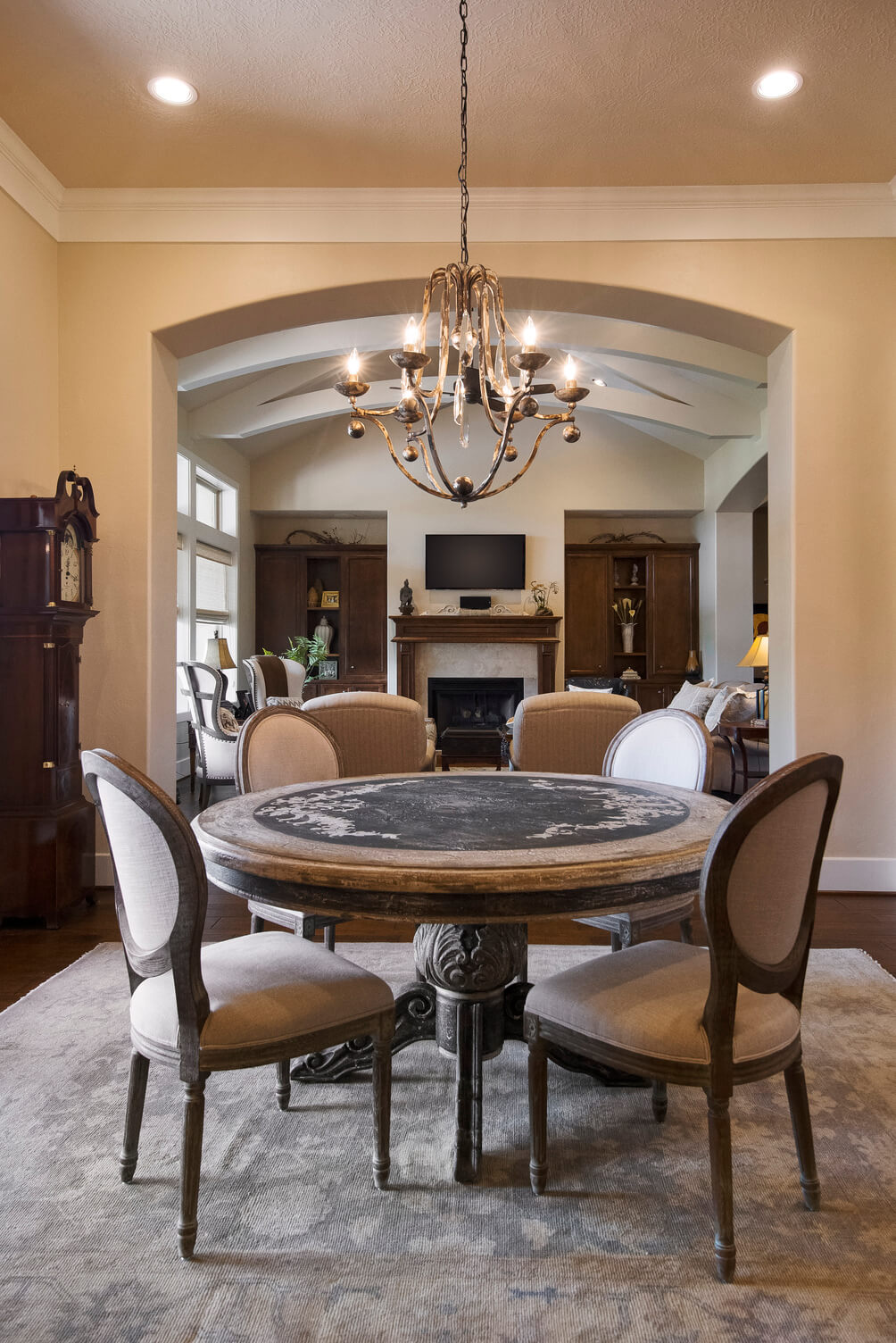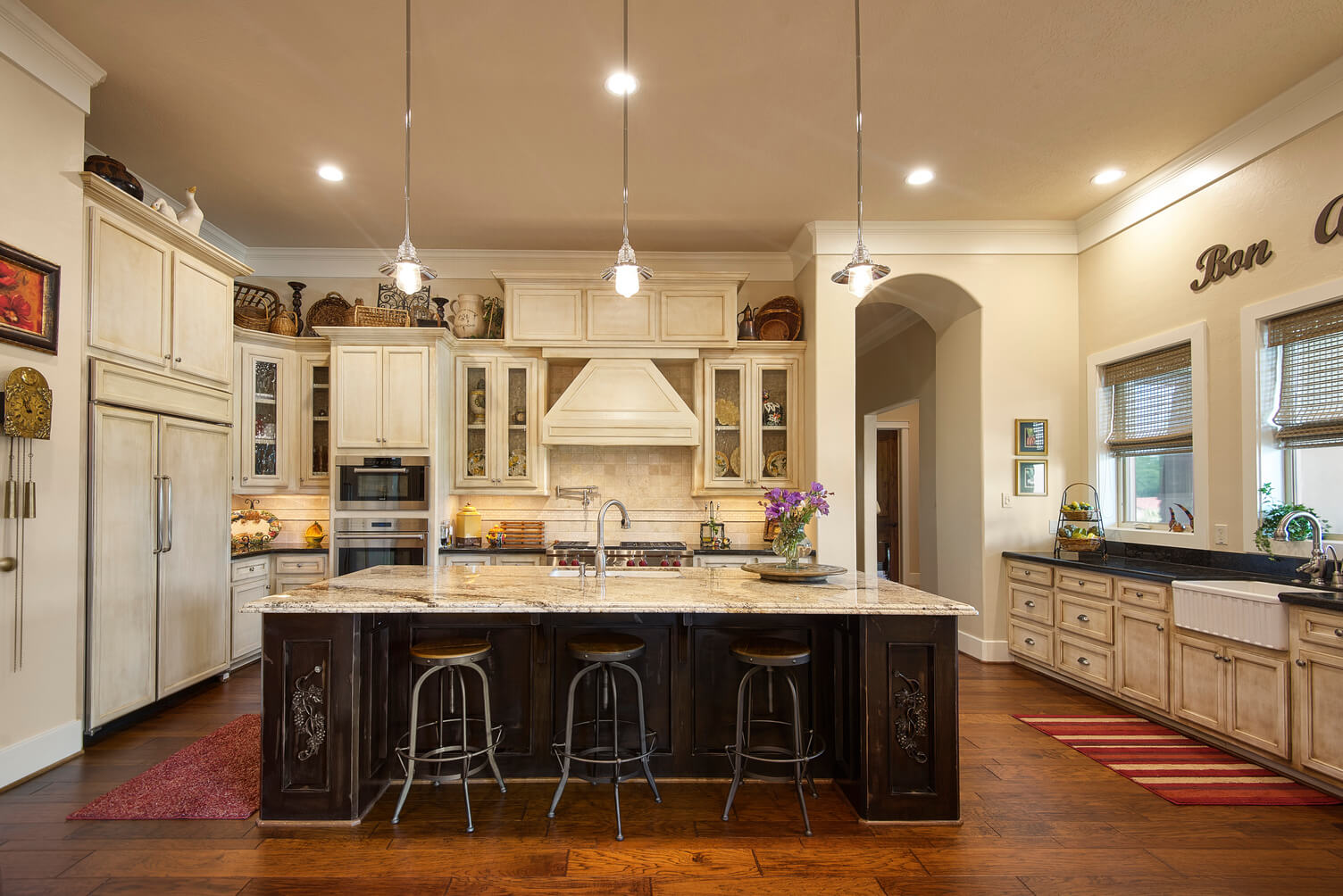 We built this custom Hill Country-style home with a stone and stucco exterior, tall columns, and a wide front lawn. The backyard features a lagoon-style pool with a spa, rock waterfall, and tanning shelf. Inside, the kitchen has double ovens and a large island, and the primary bath includes a jetted tub with dual walk-through showers.