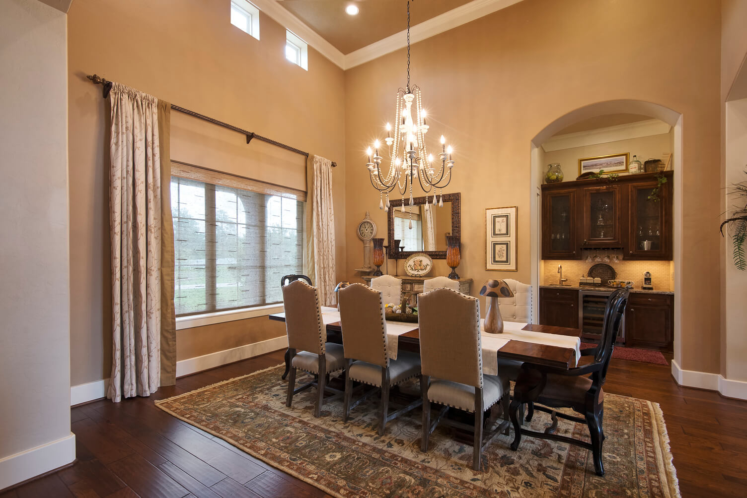 Vaulted ceiling, chandelier, wine fridge, and built-in buffet