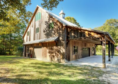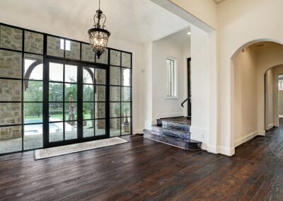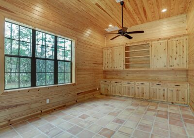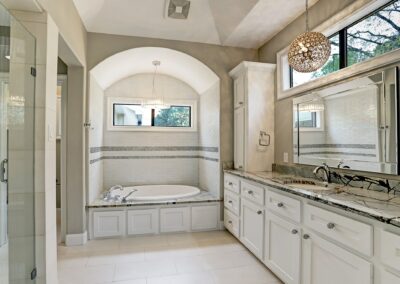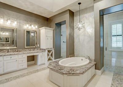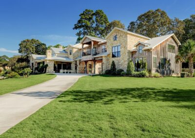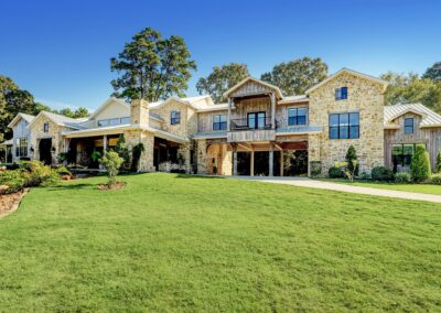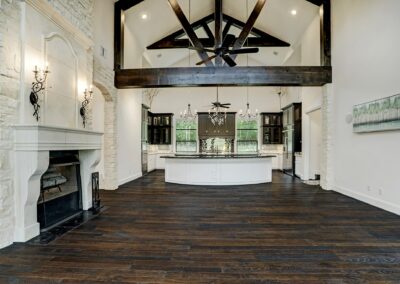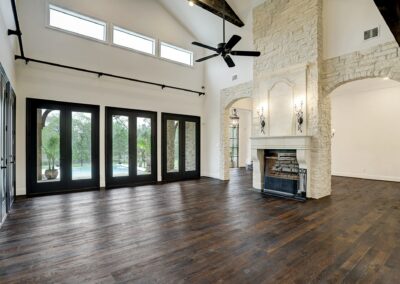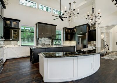 We built this Texas Hill Country-style home in Magnolia with both beauty and function in mind. The kitchen includes two large islands, granite countertops, and matching chandeliers under vaulted ceilings. The living room features a tall, double-sided stone fireplace and opens to the backyard pool. Other highlights include a wine room, spa-style bathrooms, a bunk room with space for six, a large barn-style workshop, and a warm pine study full of natural light.