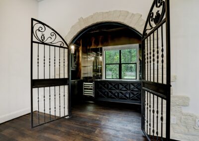 Iron doors, stone archway, mirrored backsplash, and built-in wine racks
