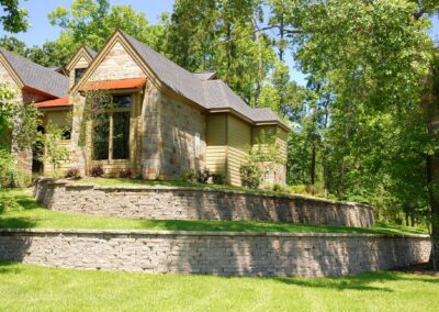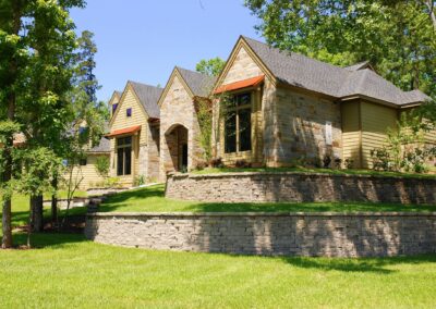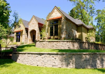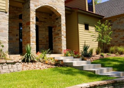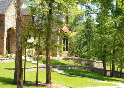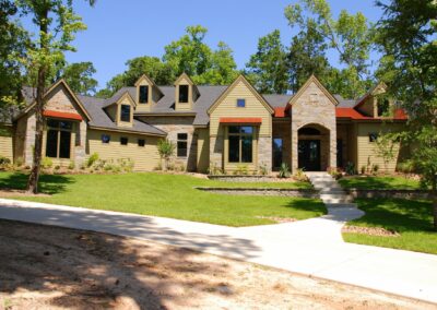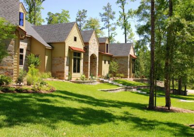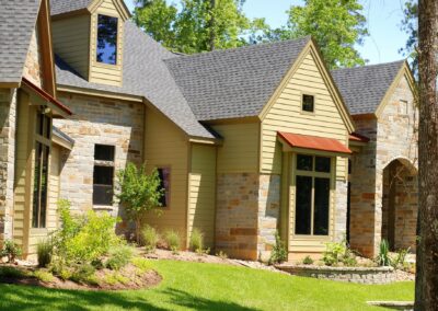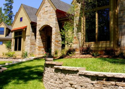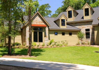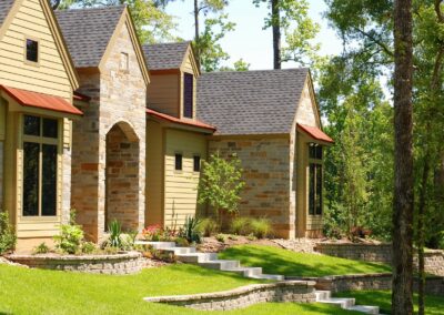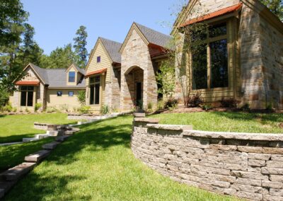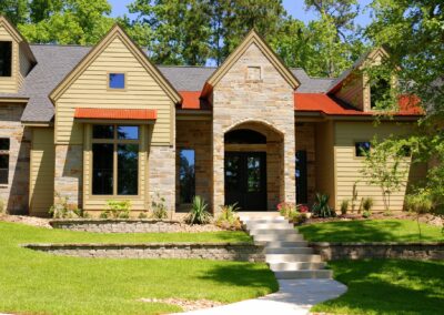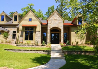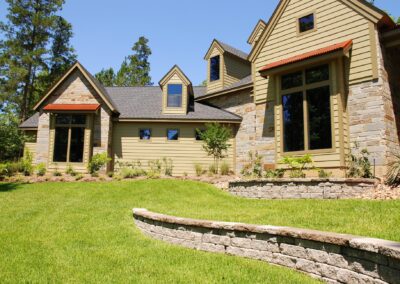 This traditional-style home in High Meadow Ranch, Magnolia, mixes modern design with rustic charm. We used natural stone and horizontal siding, along with a gabled roof and dormers. The stone entry has double doors and tall windows that make a strong first impression. A curved path with tiered steps leads to the entry, and stone retaining walls match the shape of the sloped yard perfectly.