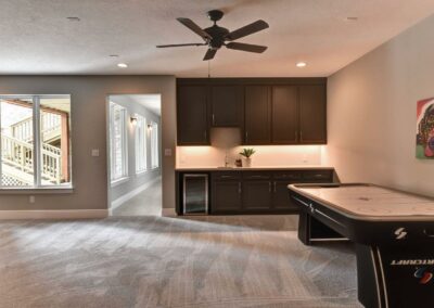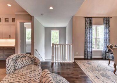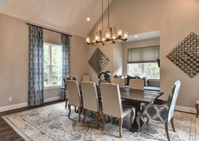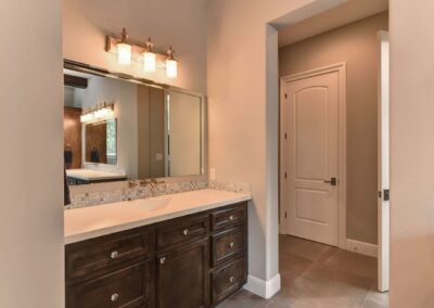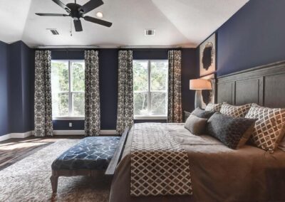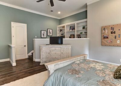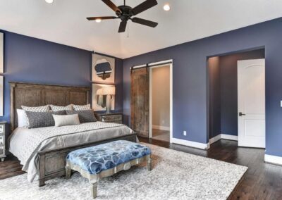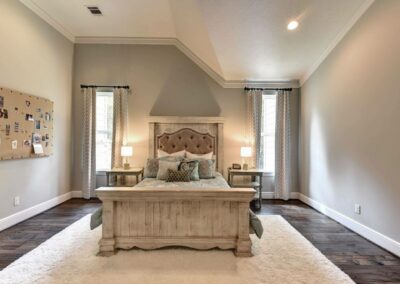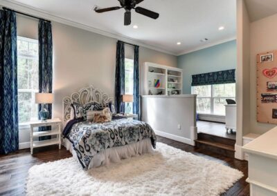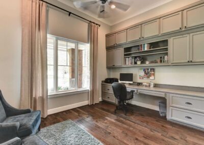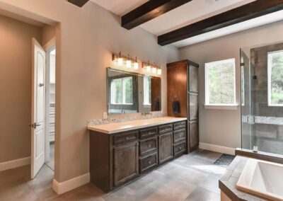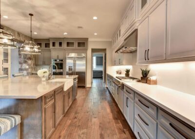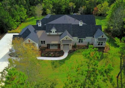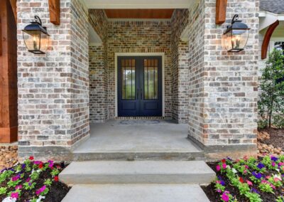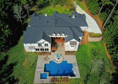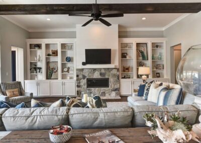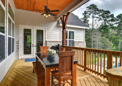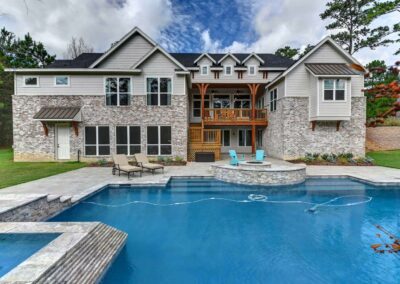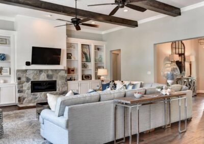 We created a comfortable and stylish home with an elevated spa, custom pool, and a round fire pit lounge. Two-level porches with wood beams and ceiling fans provide plenty of outdoor space. Inside, the kitchen has a large island and custom cabinets, and the living room features exposed beams and a stone fireplace.