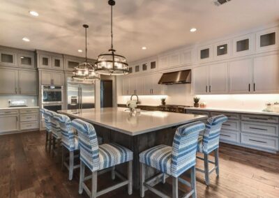 Extra-large island, custom cabinets, double ovens, and eye-catching lighting