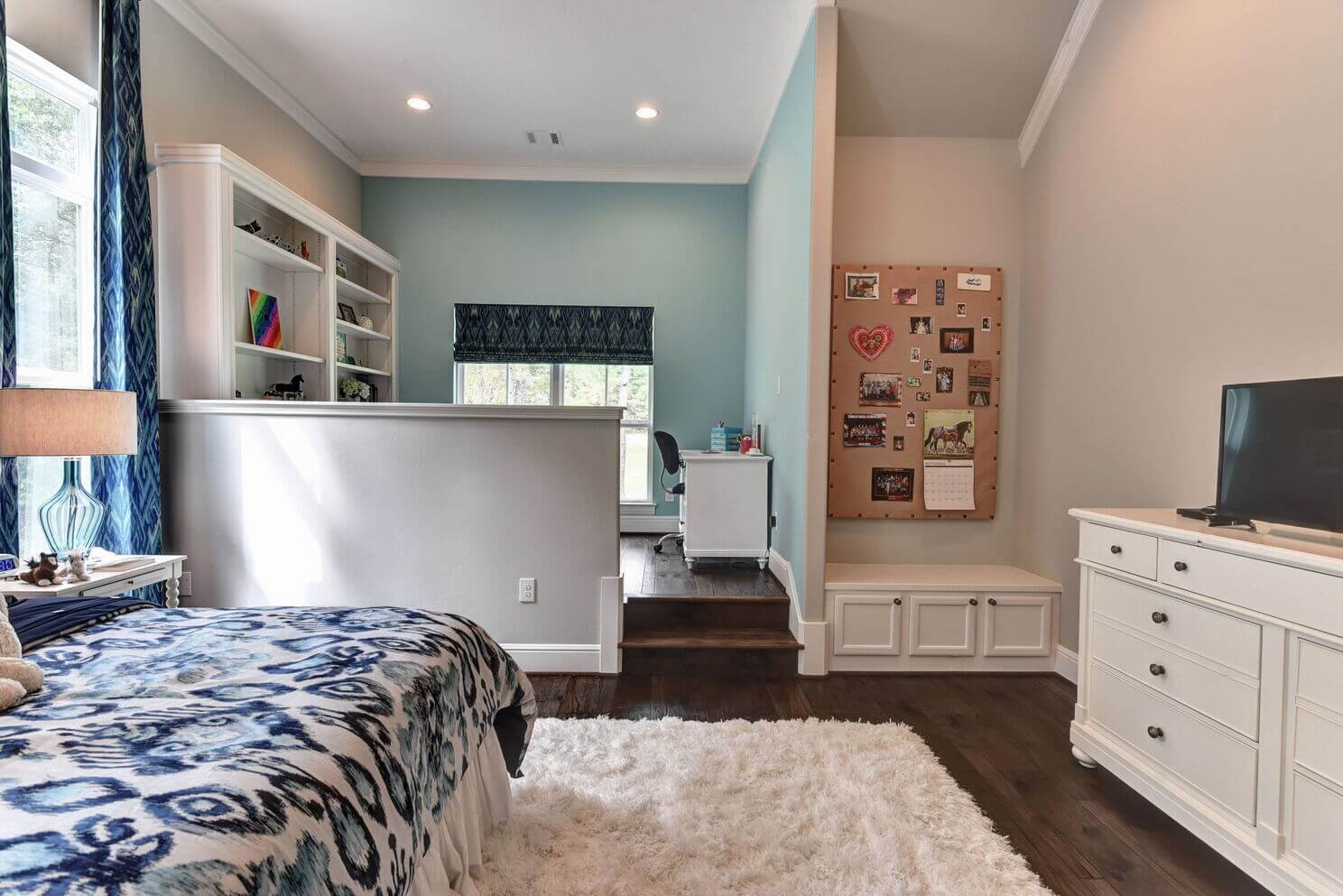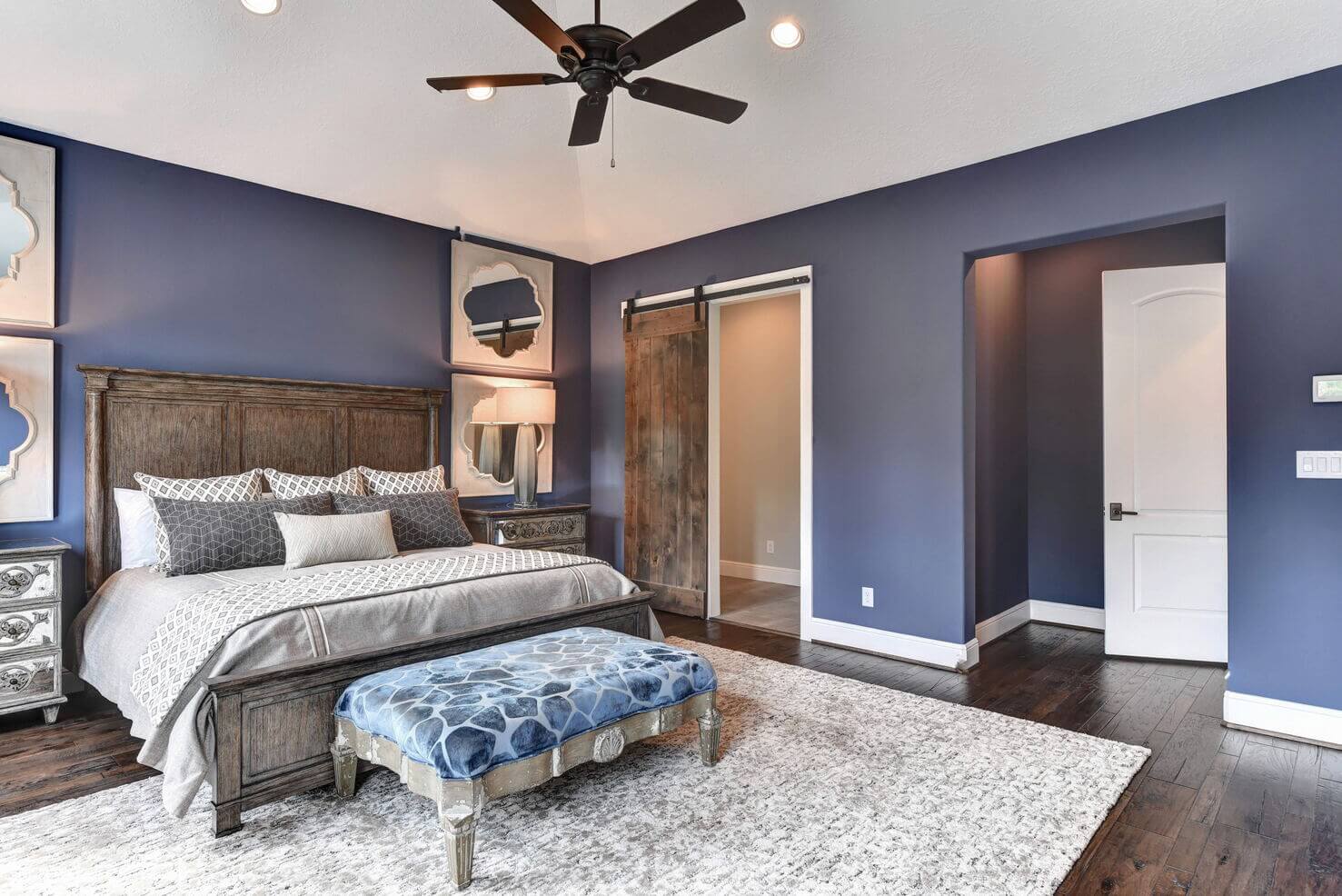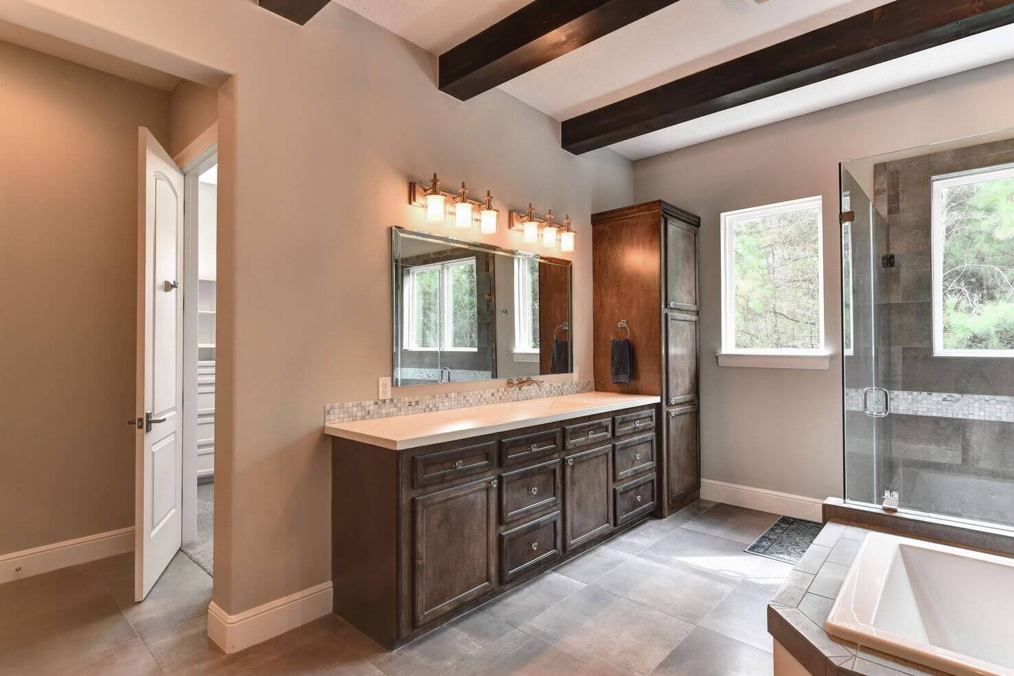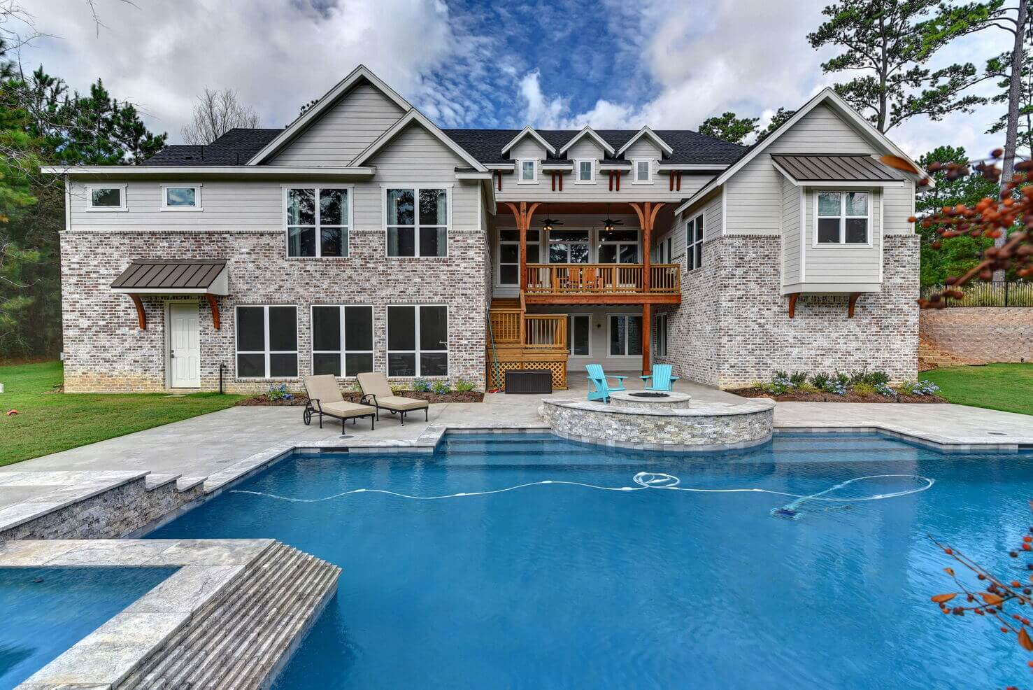 We created a comfortable and stylish home with an elevated spa, custom pool, and a round fire pit lounge. Two-level porches with wood beams and ceiling fans provide plenty of outdoor space. Inside, the kitchen has a large island and custom cabinets, and the living room features exposed beams and a stone fireplace.