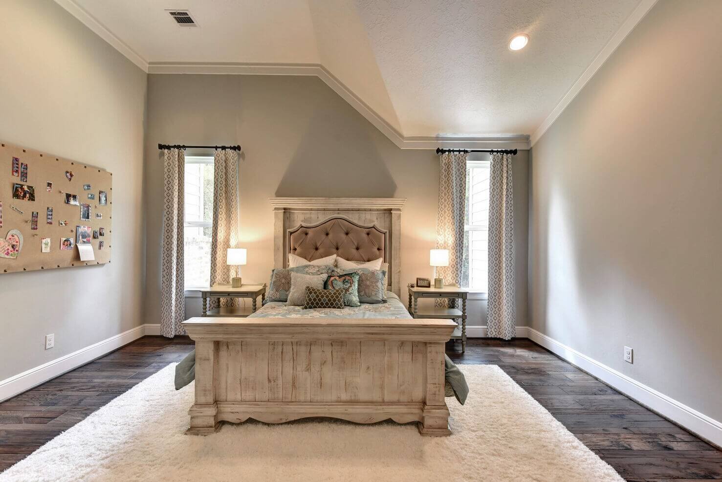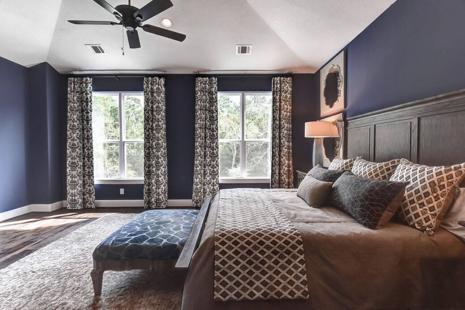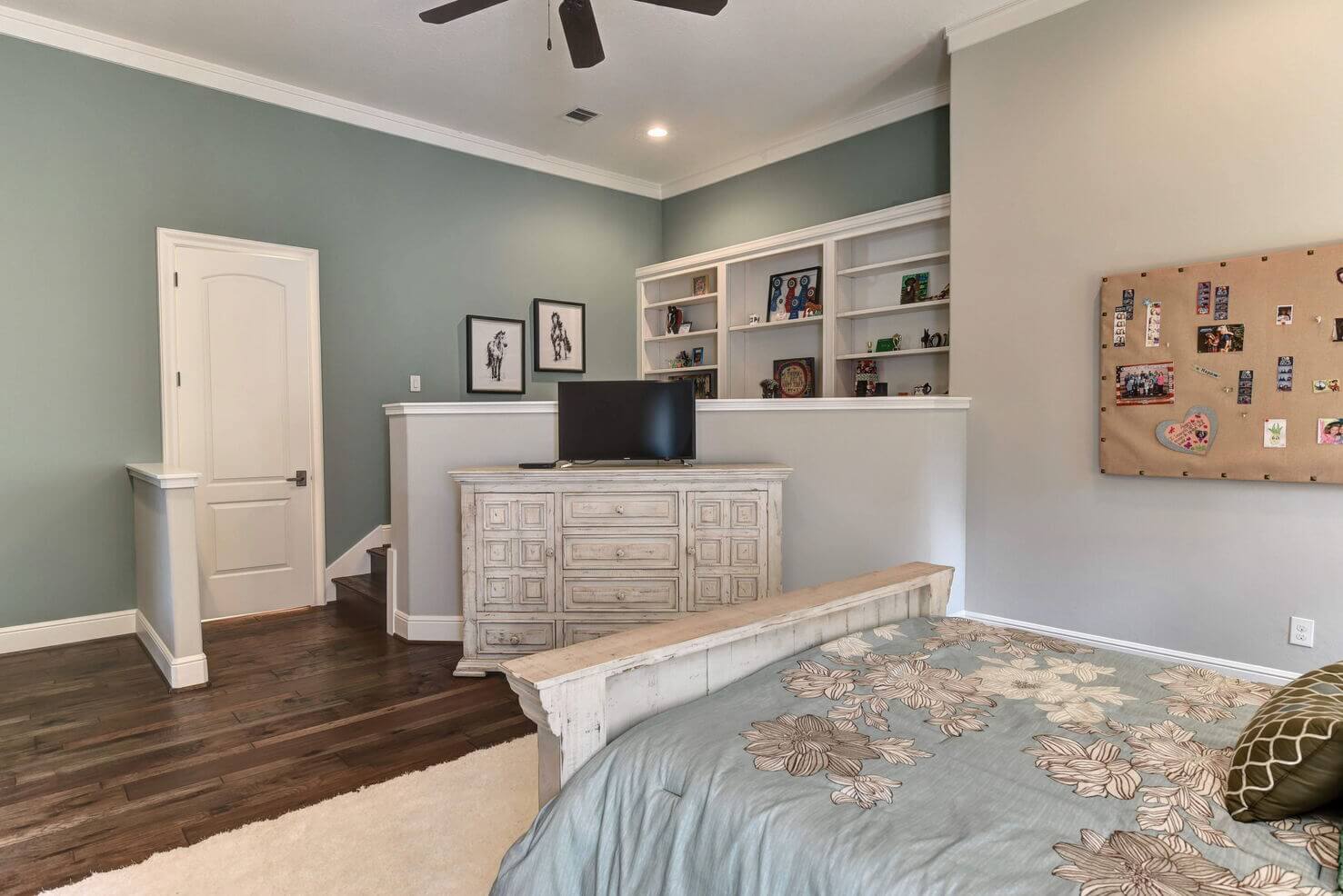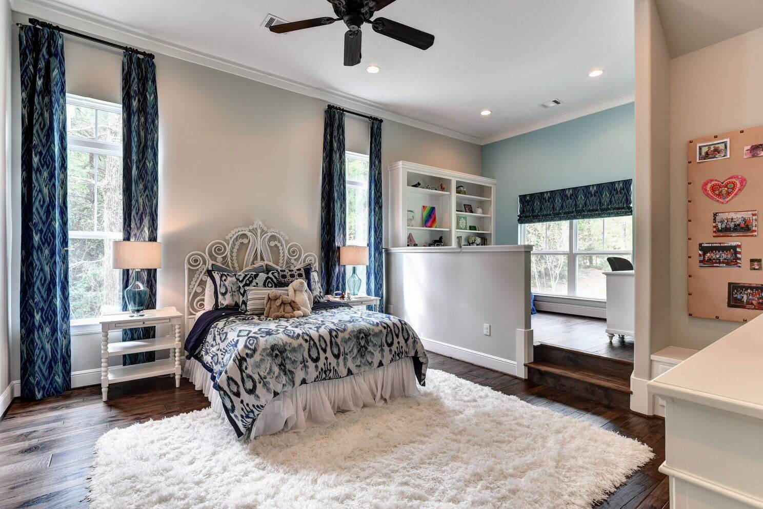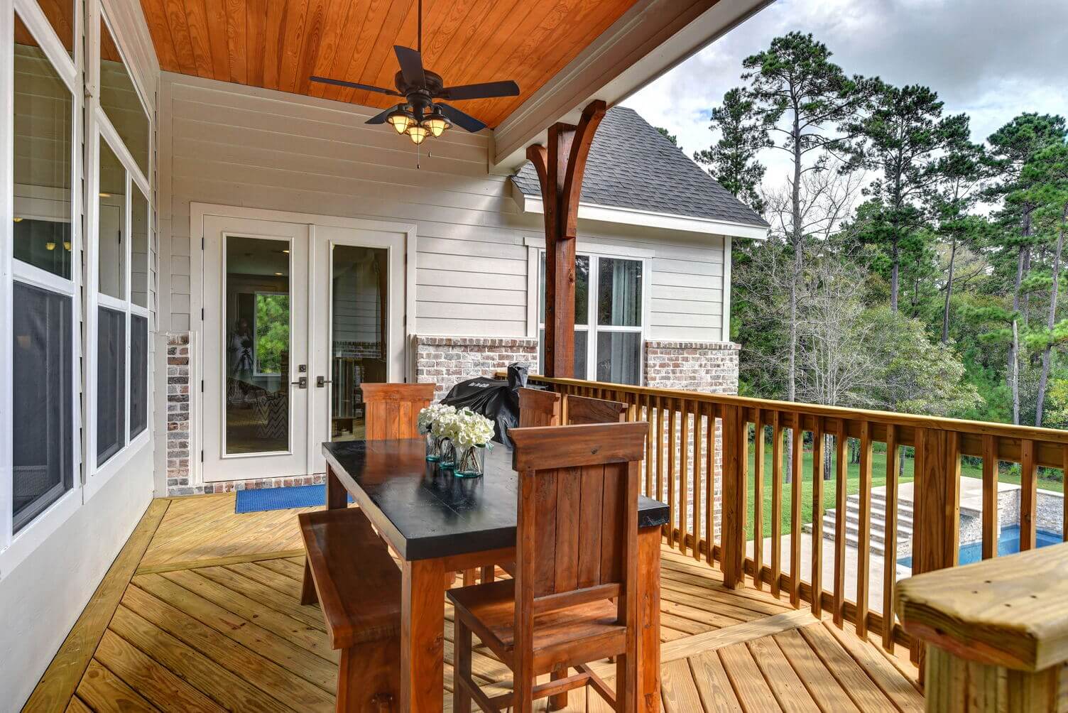 Two-level porches with wood details and double ceiling fans