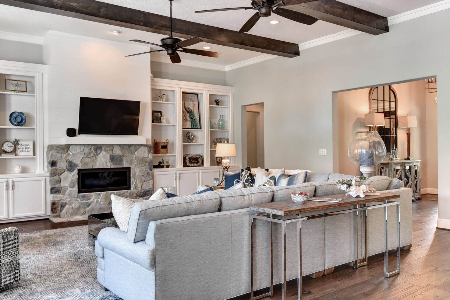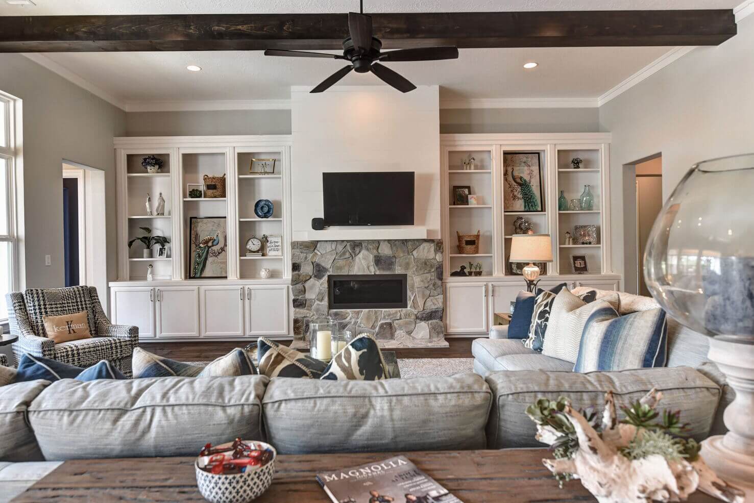 Wood beams, stone fireplace with shiplap, and built-in shelves with lighting