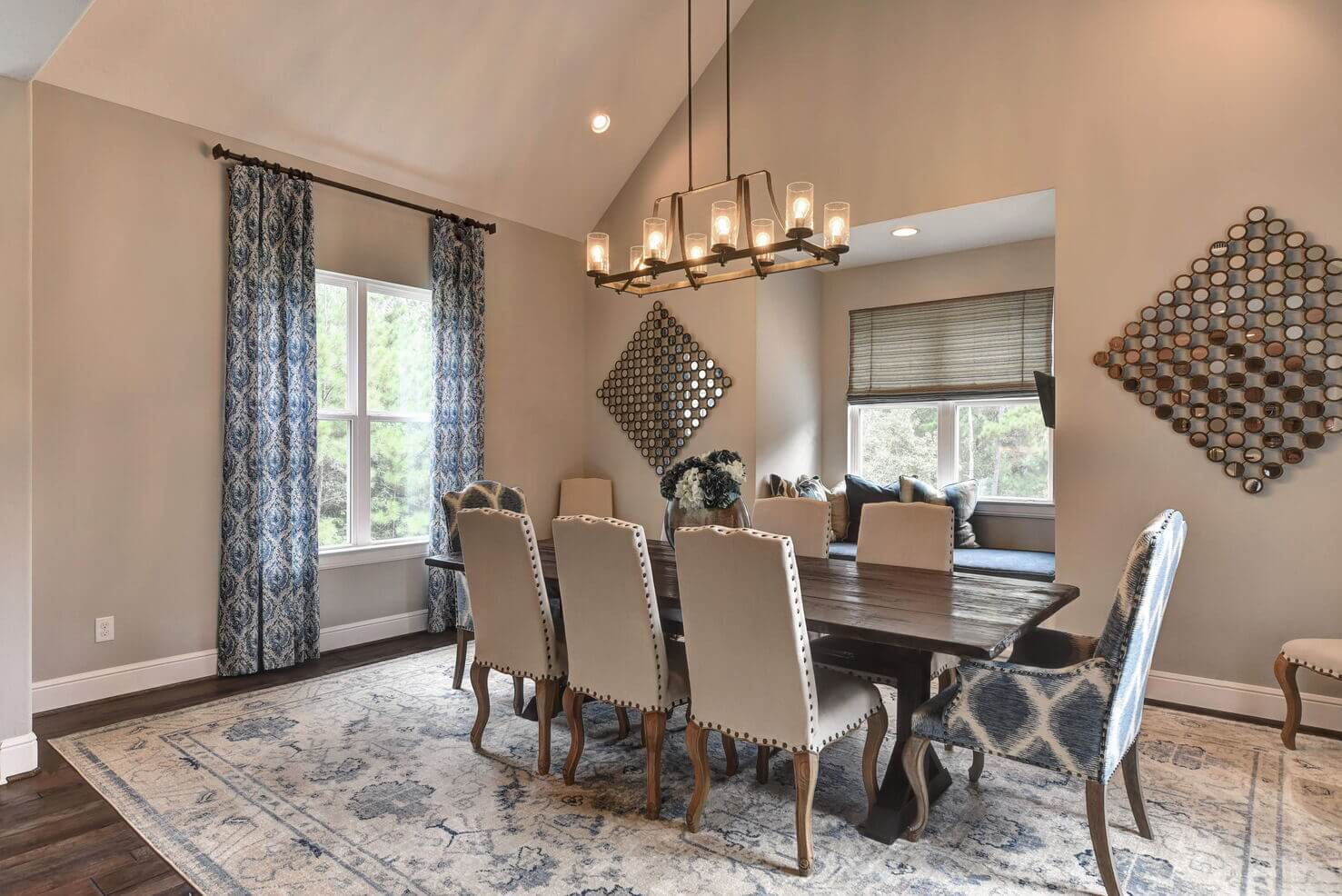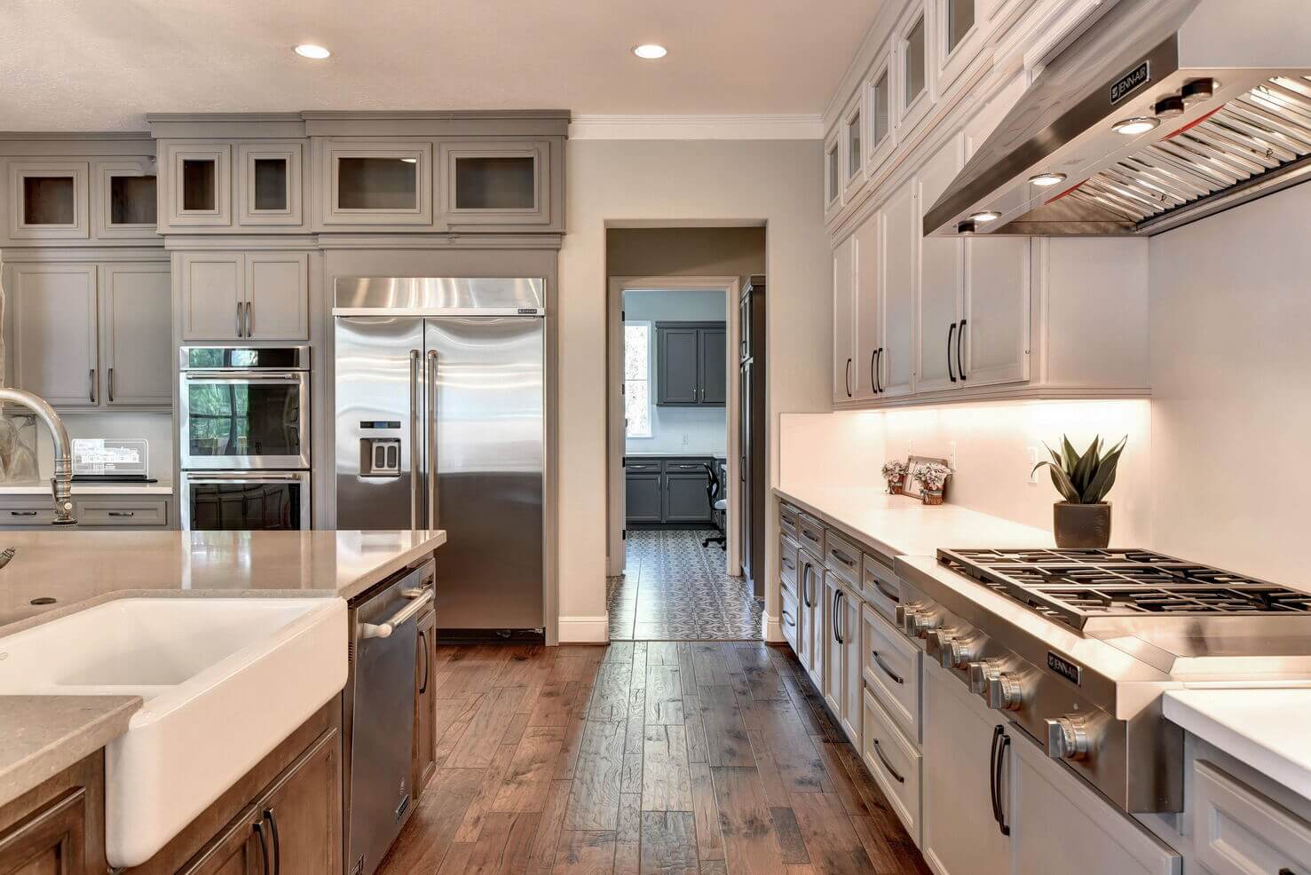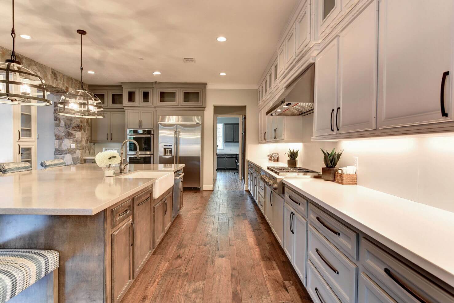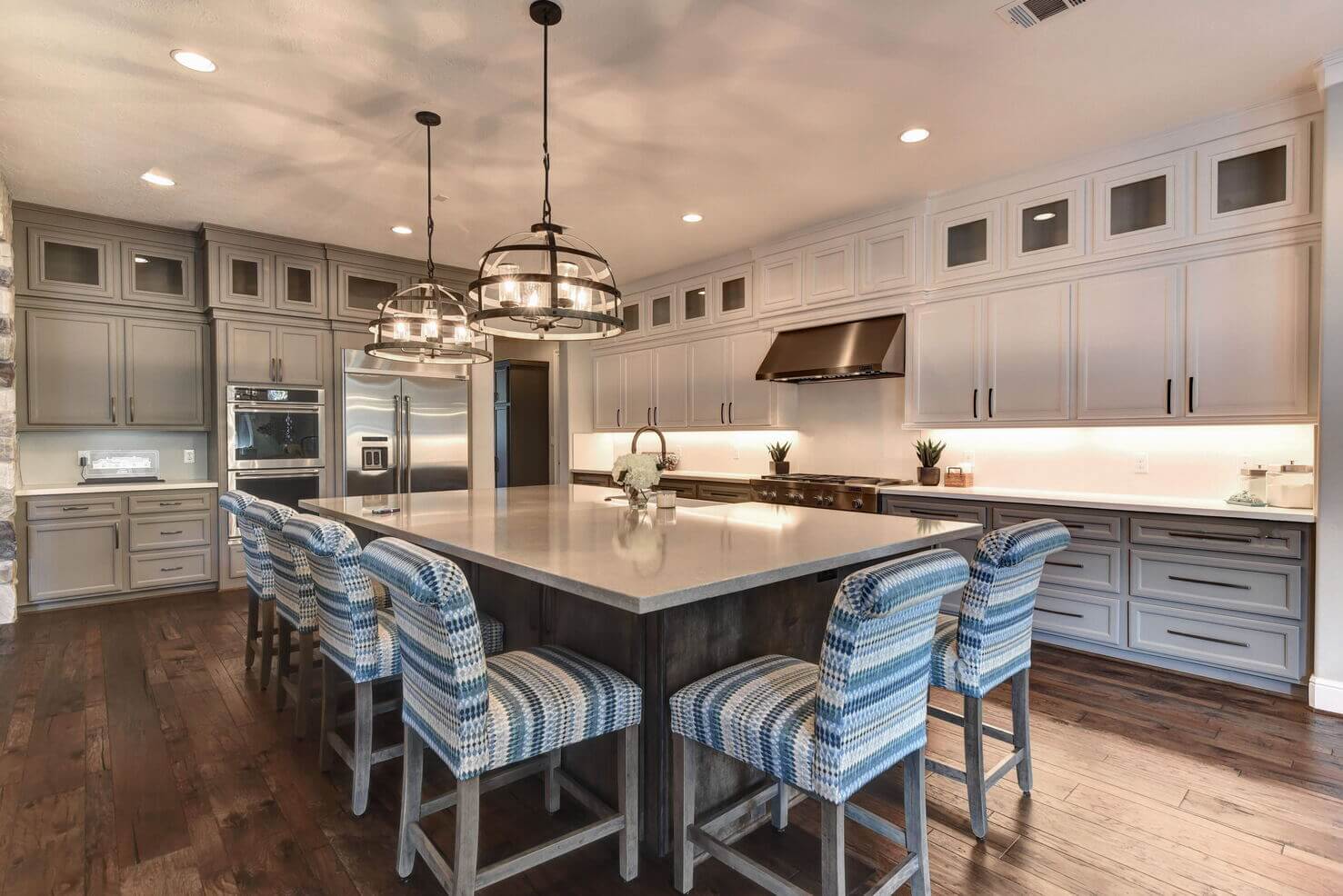 Extra-large island, custom cabinets, double ovens, and eye-catching lighting