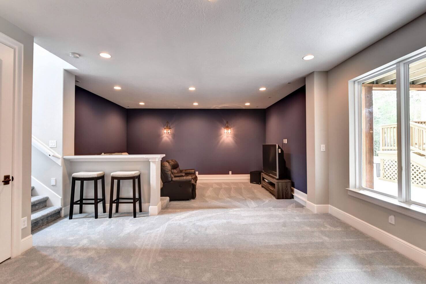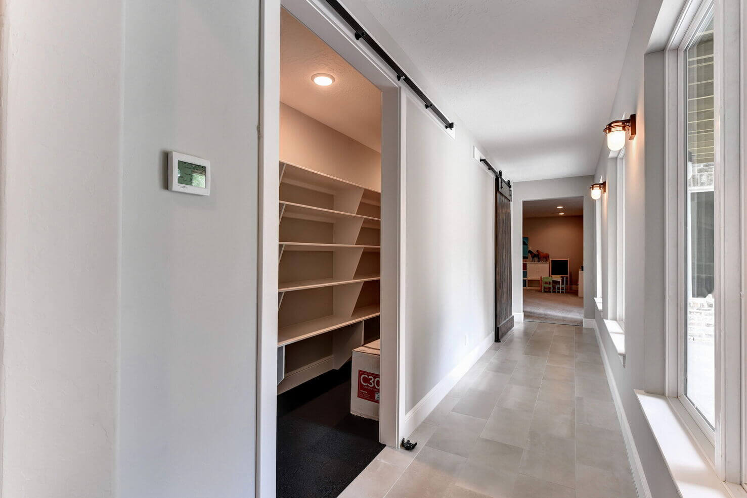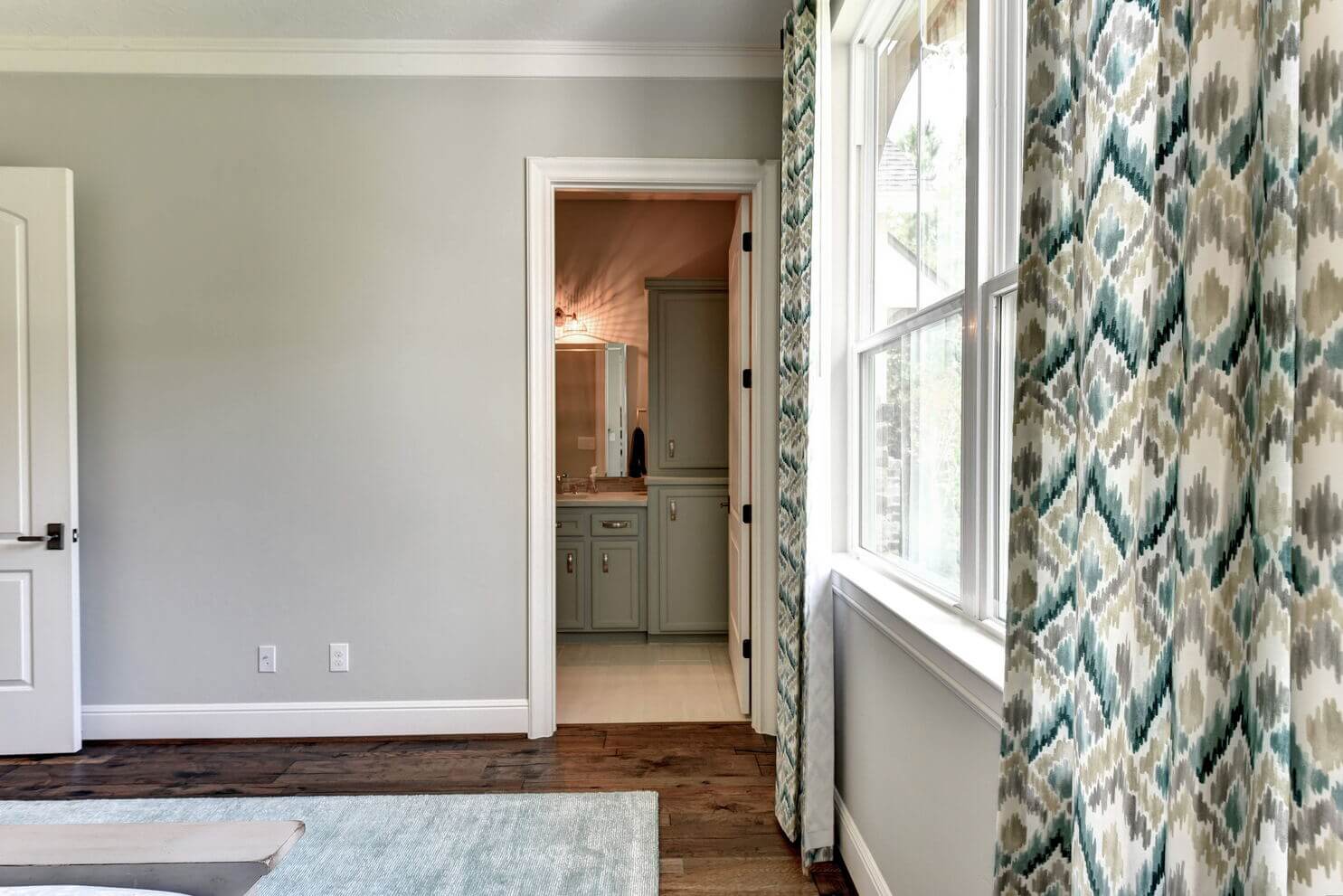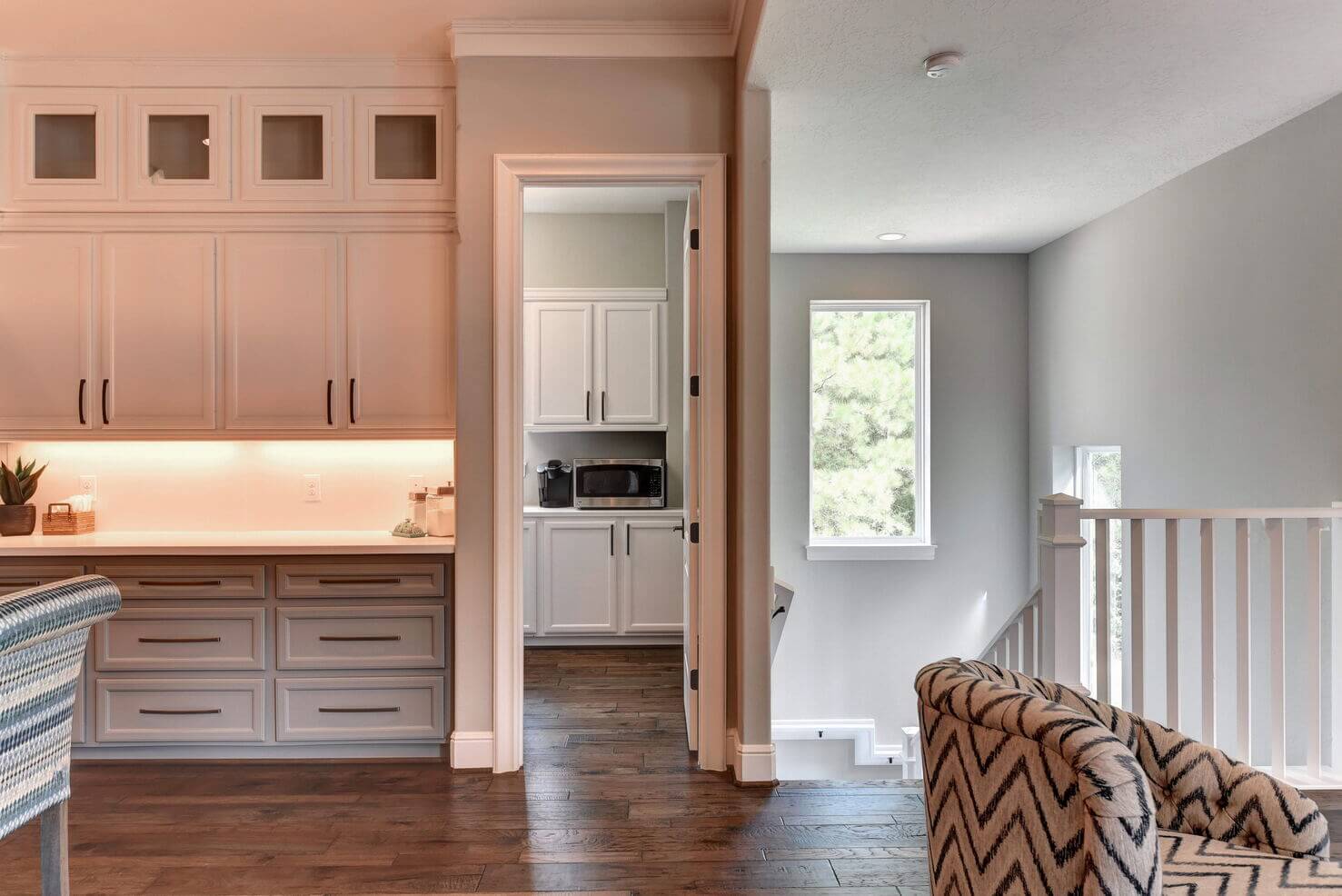 Stone walls and arched openings with custom wood trim throughout