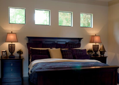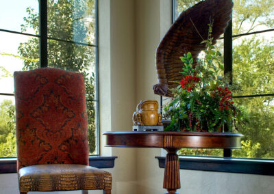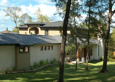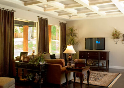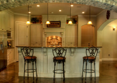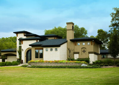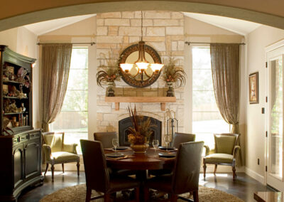 At this custom home in Blue Heron Bay near Lake Conroe, we built a stylish transitional home with a mix of light stone, bold trim, and smooth stucco. Inside, the kitchen includes granite countertops and a high-end gas stove made for cooking. The vaulted dining area features a cozy stone fireplace, and the living room shows off a deep coffered ceiling. We also added a built-in office with lots of storage for everyday use.