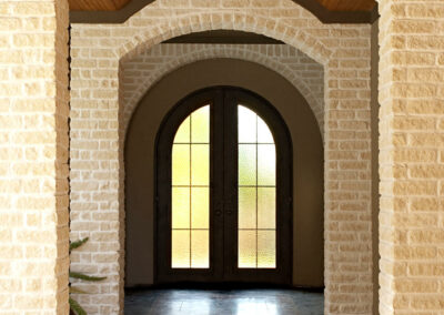 Light stone and stucco with bold trim, arched entry, exposed wood brackets, and inset details