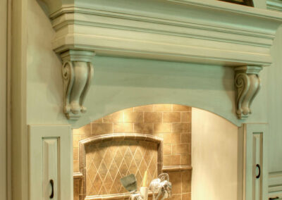 Custom vent hood with decorative corbels, granite counters, commercial gas range, and lit cabinets