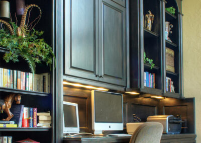 Wall of rich wood cabinets, bookcases, built-in lights, and space for multiple devices
