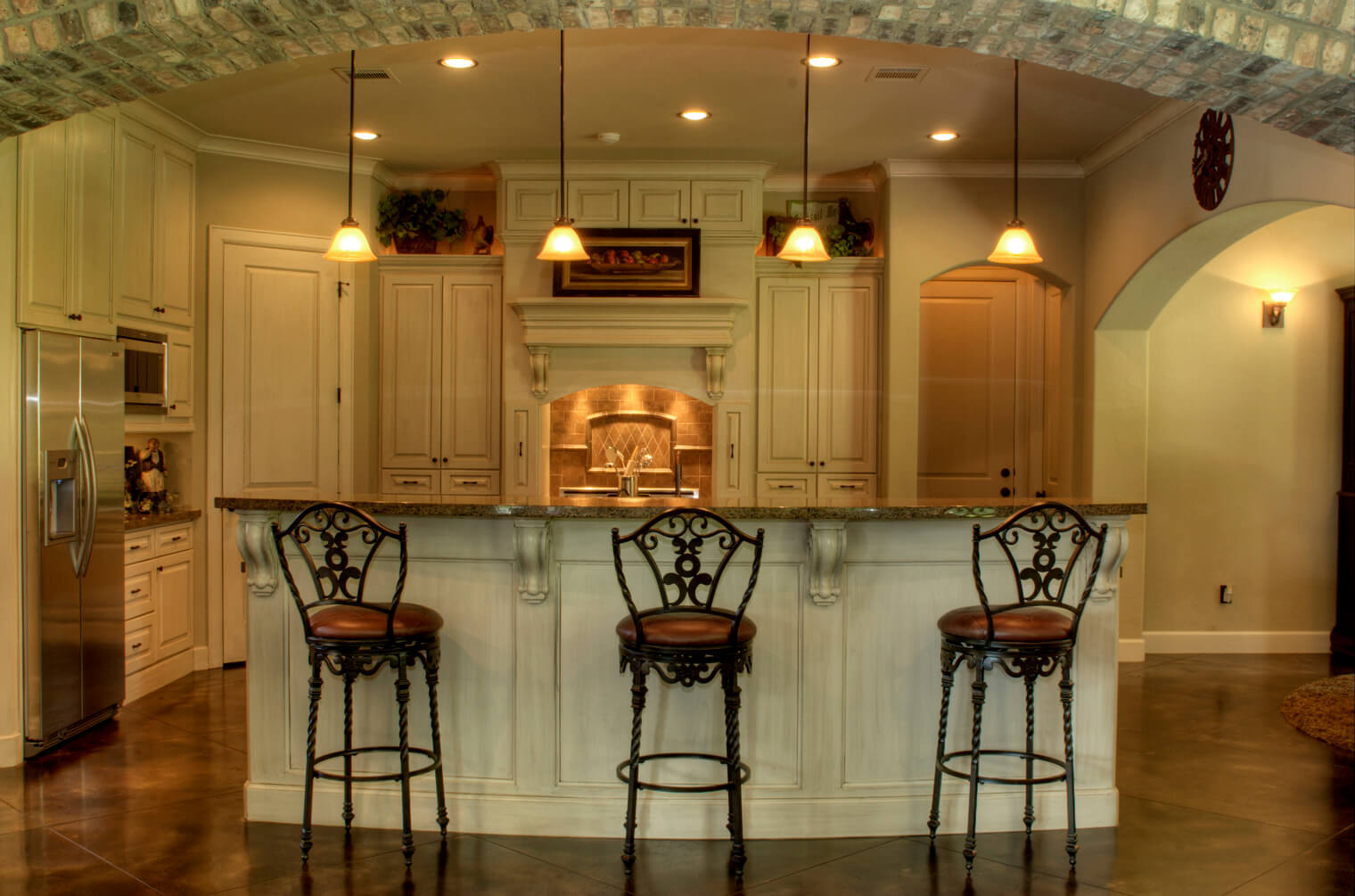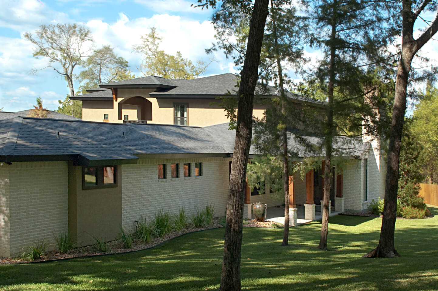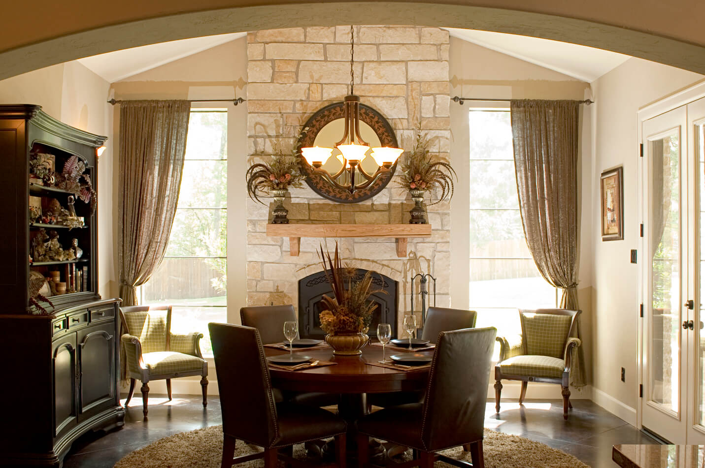 At this custom home in Blue Heron Bay near Lake Conroe, we built a stylish transitional home with a mix of light stone, bold trim, and smooth stucco. Inside, the kitchen includes granite countertops and a high-end gas stove made for cooking. The vaulted dining area features a cozy stone fireplace, and the living room shows off a deep coffered ceiling. We also added a built-in office with lots of storage for everyday use.