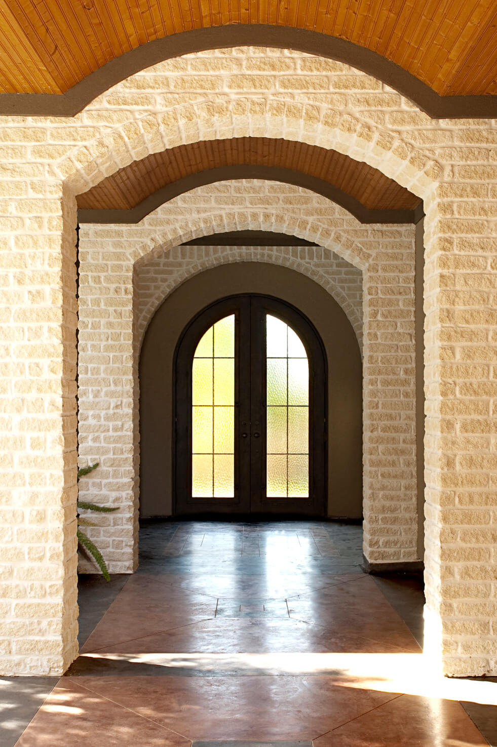 Light stone and stucco with bold trim, arched entry, exposed wood brackets, and inset details