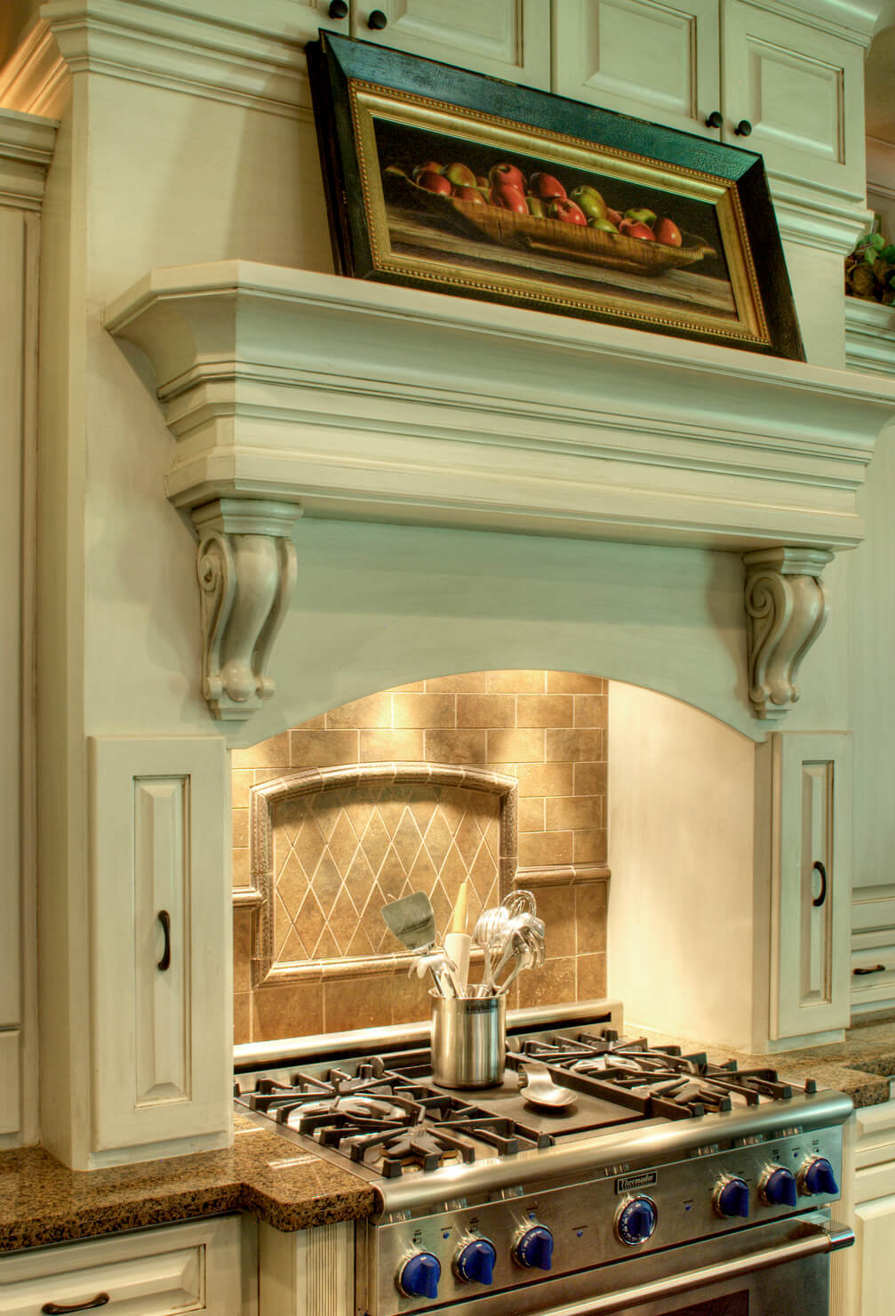 Custom vent hood with decorative corbels, granite counters, commercial gas range, and lit cabinets