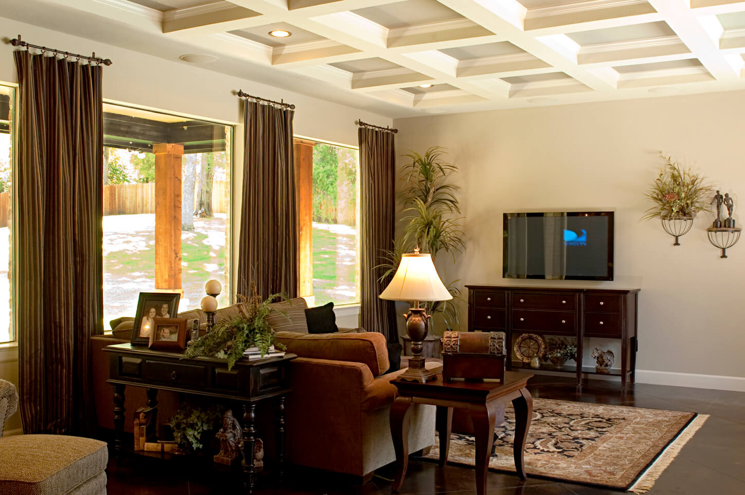 Deep coffered ceiling, recessed lights, large windows, and classic trim
