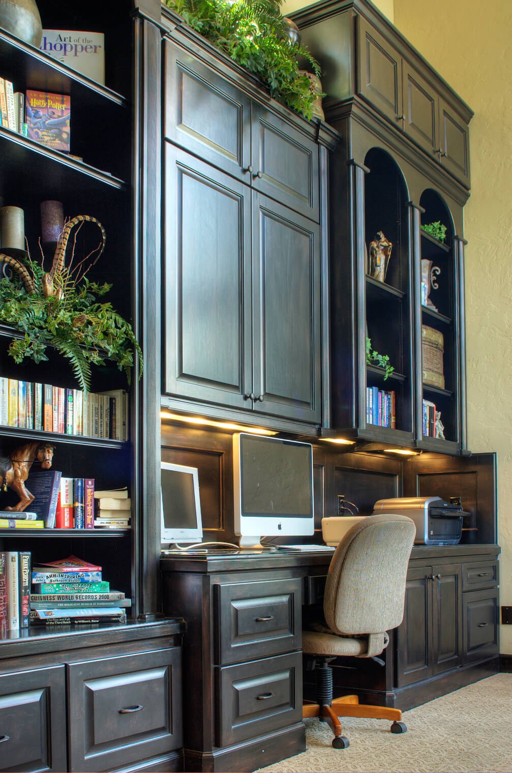 Wall of rich wood cabinets, bookcases, built-in lights, and space for multiple devices